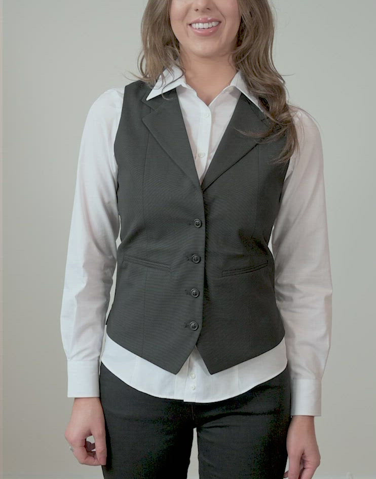 The women’s black classic vest is formal and classic. The single-breasted vest has four buttons with a lapel and two welt pockets. The back of the vest is made of a black rayon fabric and has an adjustable waist-tab. The vest has a traditional fit and is made of 65% viscose and 35% polyester.