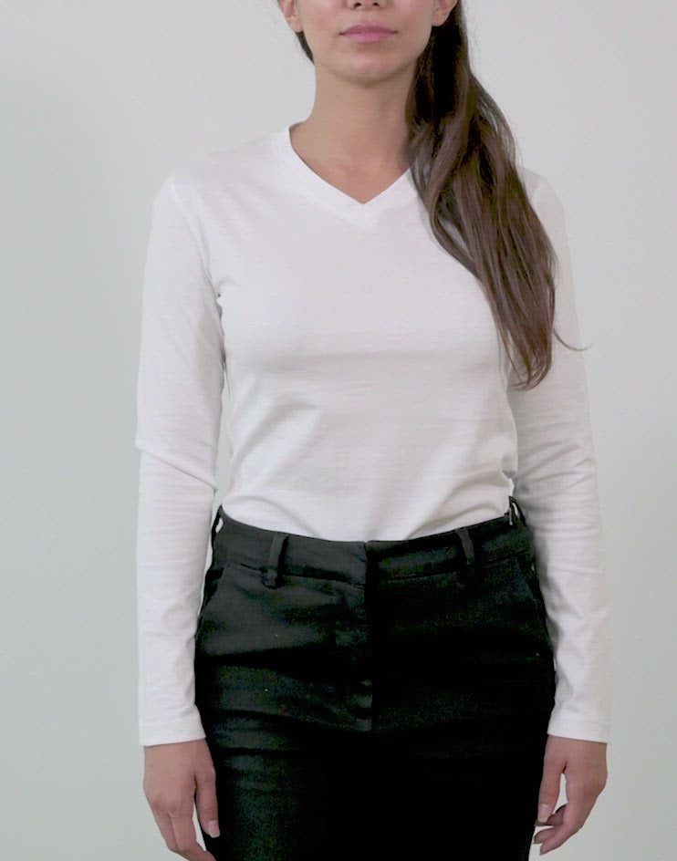 The classic long sleeve V-neck shirt has a feminine fit for comfort and style. The shirt is made of 100% cotton.