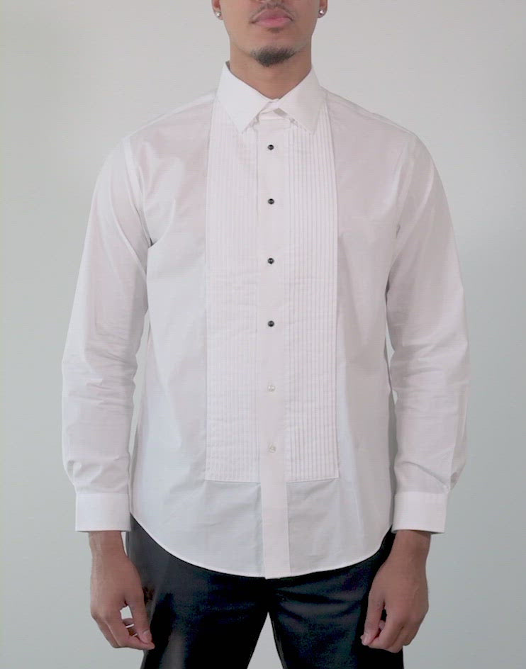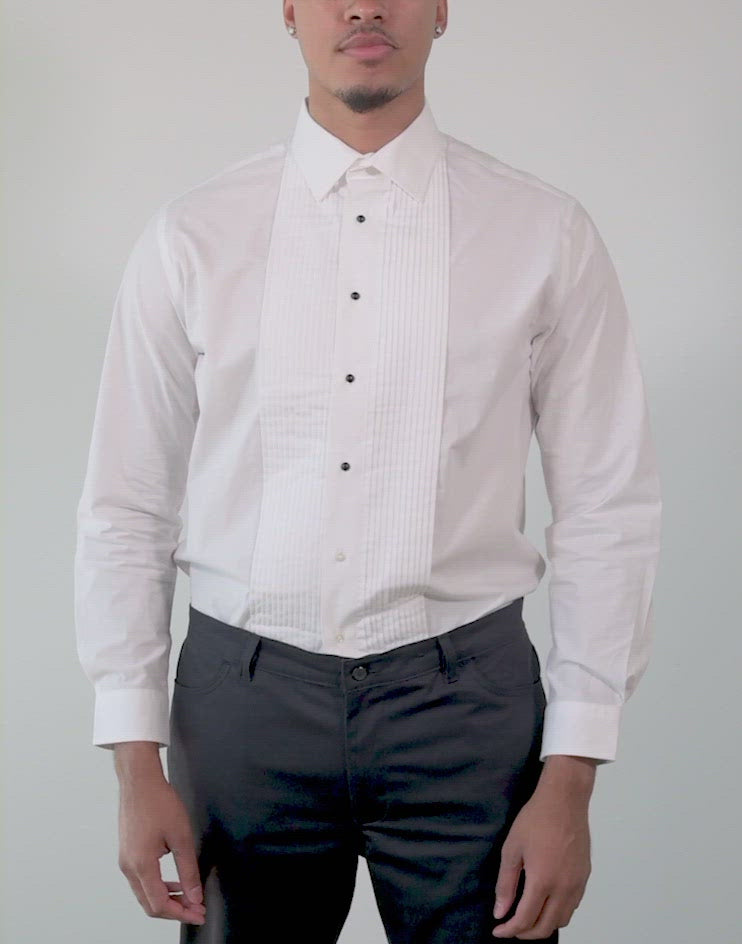 The tuxedo shirt is perfect for formal occasions. It has a traditional pleated front detail and black stud buttons. The shirt has a classic fit and is made of 65% cotton, 35% polyester.
