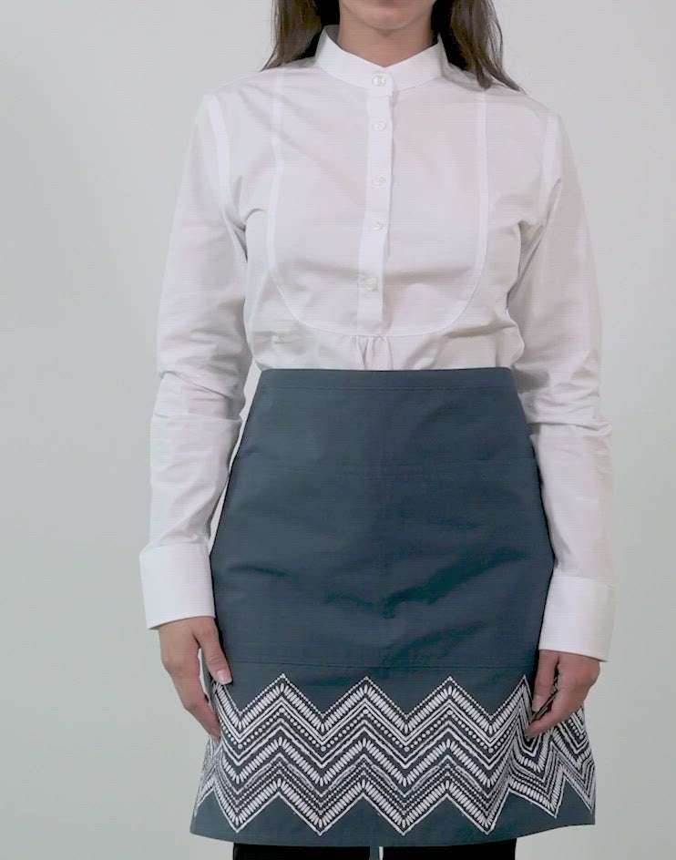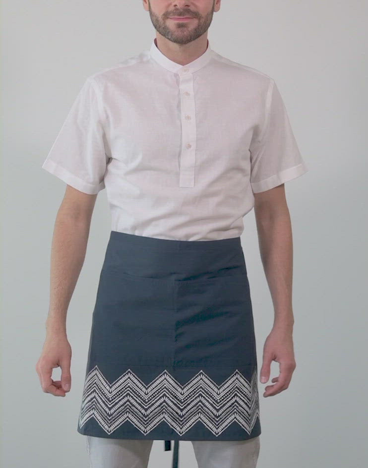 The navy-blue knee-length apron with white details is stylish and protects your clothing from spills and splatters. The apron has an adjustable waist tie to comfortably fit any body type. The apron also has spacious left and right front pockets which are perfect for keeping kitchen tools and supplies close by. The apron is made of 100% cotton which is easy to wash.