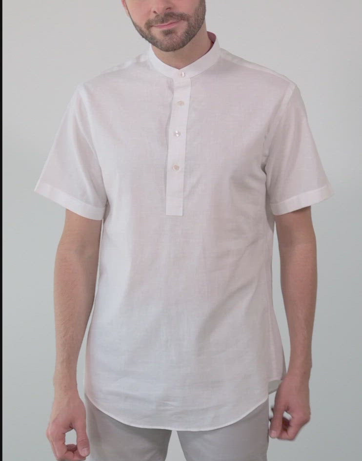 Men’s White Linen Henley Short Sleeve Shirt with Pink Inside Collar Contrast