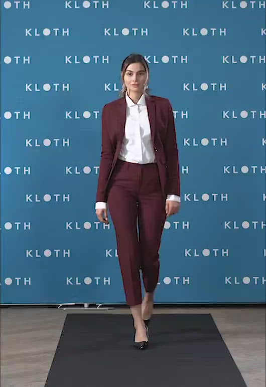 This burgundy suit jacket for women features a classic tailored fit, both flattering and timeless. Made from a wool blend, it is perfect during cooler months. The suit jacket also features a single button closure and two side pockets.